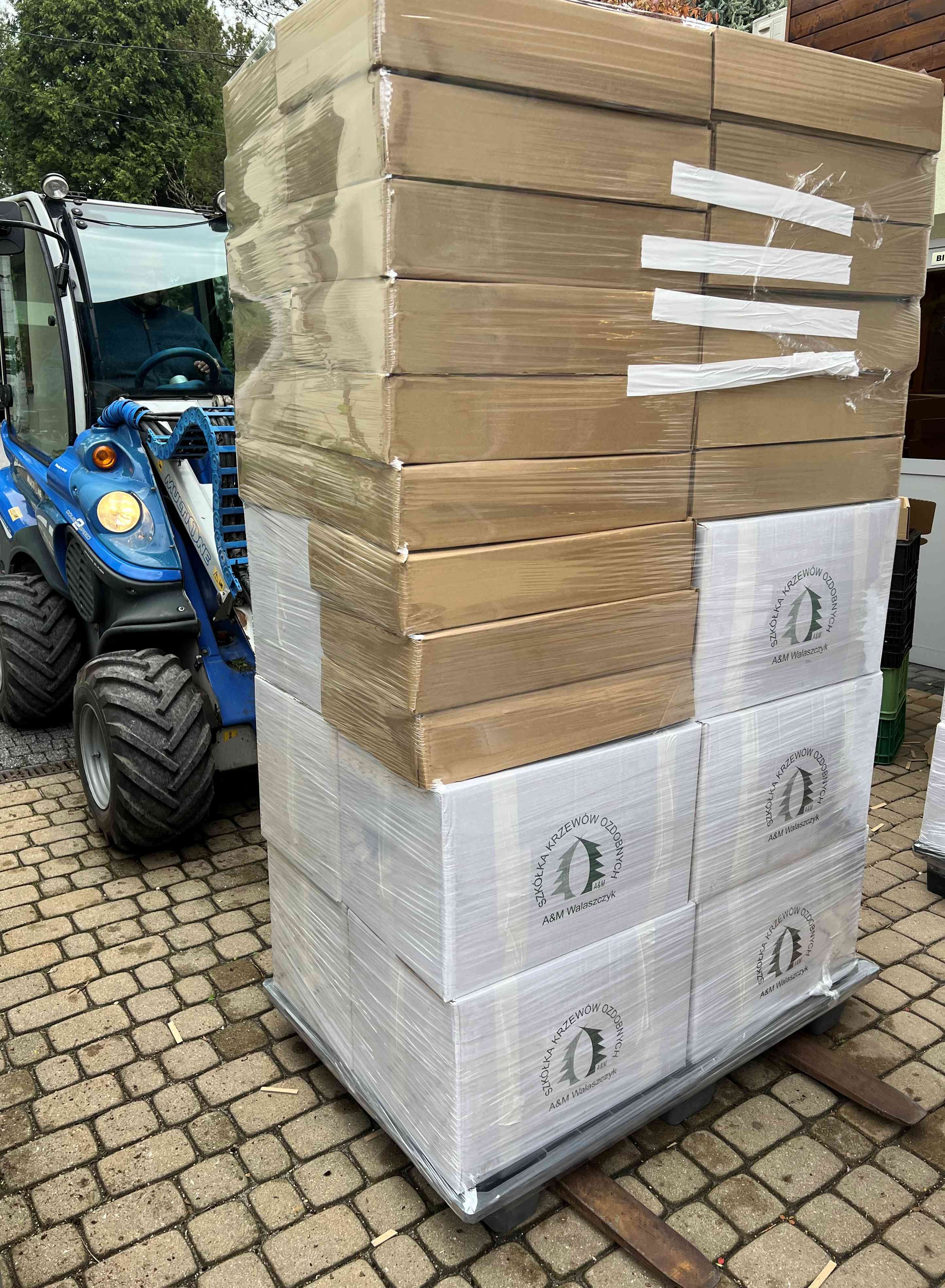 Europaleta z sadzonkami liściastymi na górze i sadzonkami iglastymi na dole przygotowana do wysyłki.